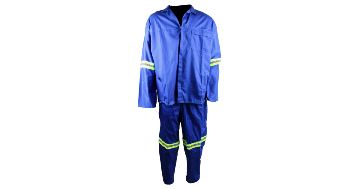 Blue 2-piece suit featuring reflective tape for enhanced visibility. Designed for durability and comfort in work or industrial environments, providing reliable protection during extended use.