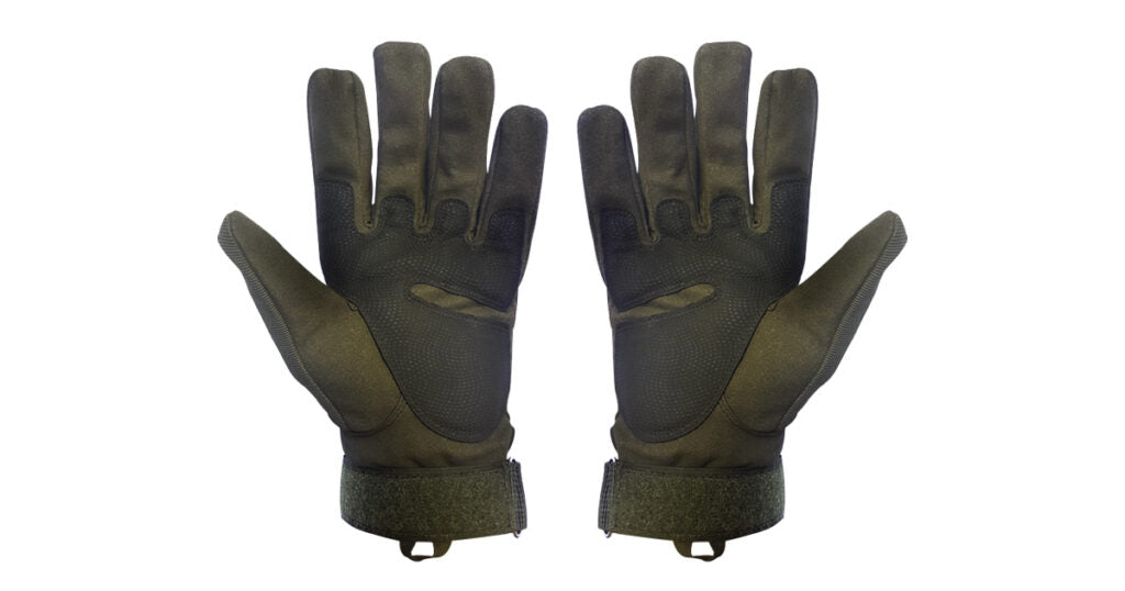 Full Finger Tactical Gloves available in Black or Olive Green colour. Includes adjustable velcro strap